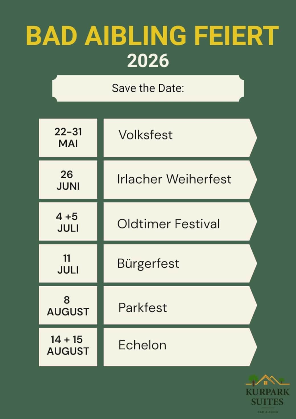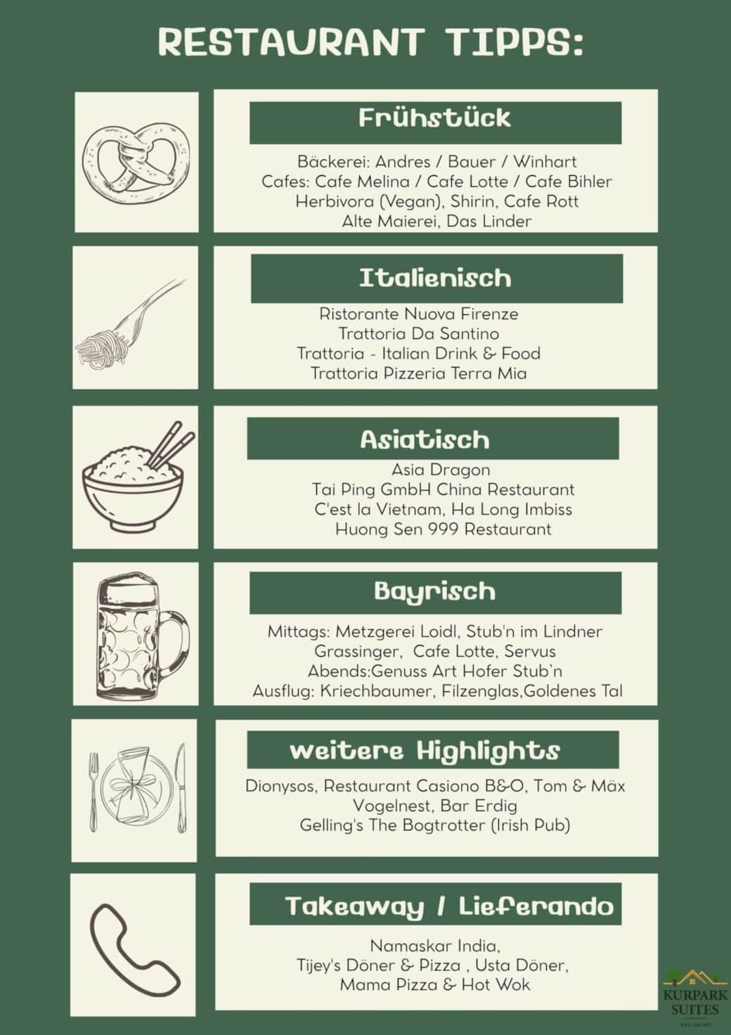يمكن للزائرين الاستمتاع بـ الحمّامات الطينية والحرارية الشهيرة، والتنزّه في الممرات الهادئة داخل الحديقة العلاجية (كوربارك)، واكتشاف دفء الضيافة البافارية في المقاهي والمطاعم التقليدية.
